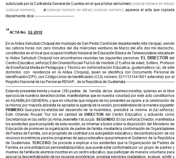 Acta, según formulario PRA-FOR-25 “Certificación del Acta de nombramiento del Representante Legal de la Primera Junta Directiva de la Organización de Padres de Familia”.