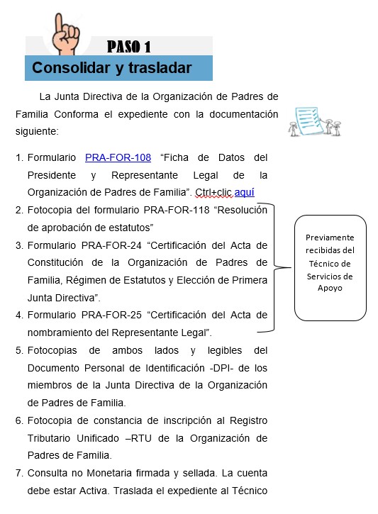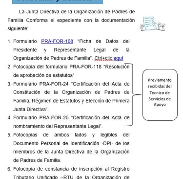Entregue la documentación necesaria de acuerdo a la lista de cotejo véala aquí. El Técnico de Servicios de Apoyo y/o Facilitador de Organización Escolar Recibe el expediente, verifica que toda la documentación esté completa y en orden, y lo traslada al Departamento/Sección de Organización Escolar de la DIDEDUC(GUATEMALA, 2018)